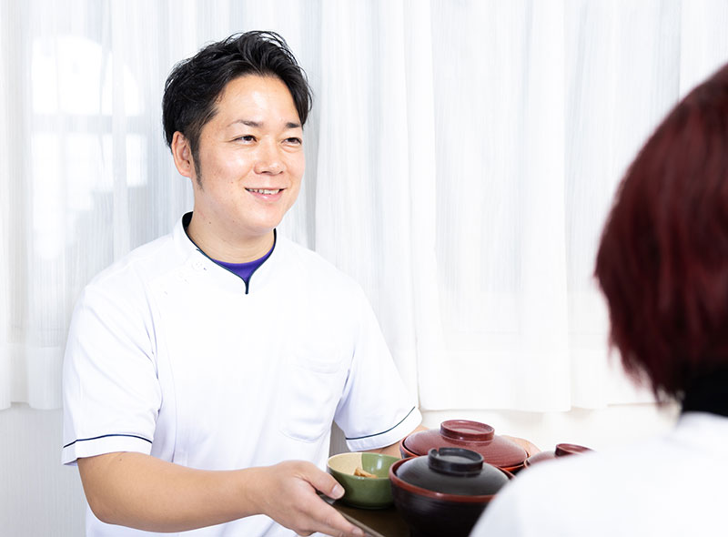 当院には、専門の知識を持つ管理栄養士が常勤しています。患者さん一人ひとりの病状や体質に合わせて、栄養面からのサポートを行っています。食事を通じて心と体の回復を支え、安心して治療に専念できるようお手伝いしています。